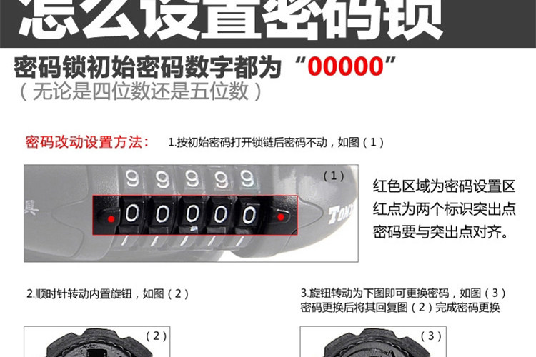 Change the new password: Dial five zero numbers, the scale standard, unplug the lock core has a iron knob, turn it clockwise 90 degrees to twist it, and then you can turn the number set the need to replace the new password Quasi-scale standard) Then turn the iron knob 90 degrees counterclockwise. The new password is set successfully. After the lock, be sure to re-remember the new password, the number of chaos, others do not know your password, it can not be opened.