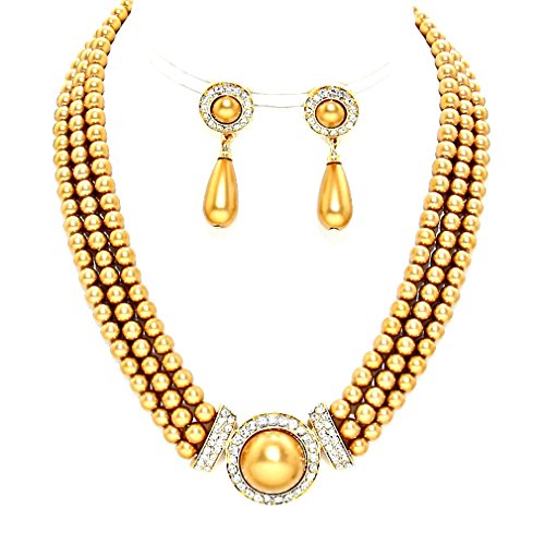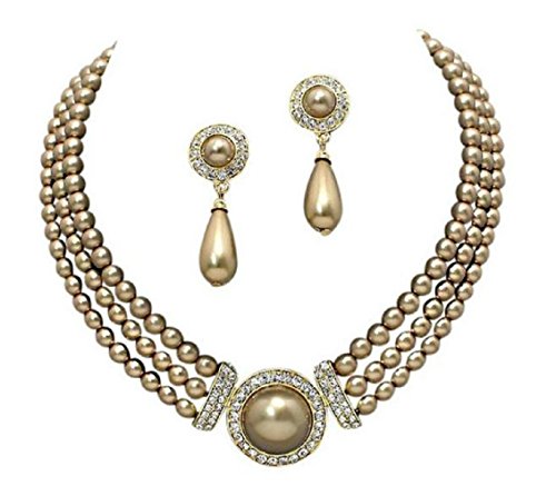 Gorgeous three Strands of Glass Golden Brown Pearl With Silver Rhinestone Crystal Pavé round gold tone medallion necklace it comes with elegant matching free earrings.