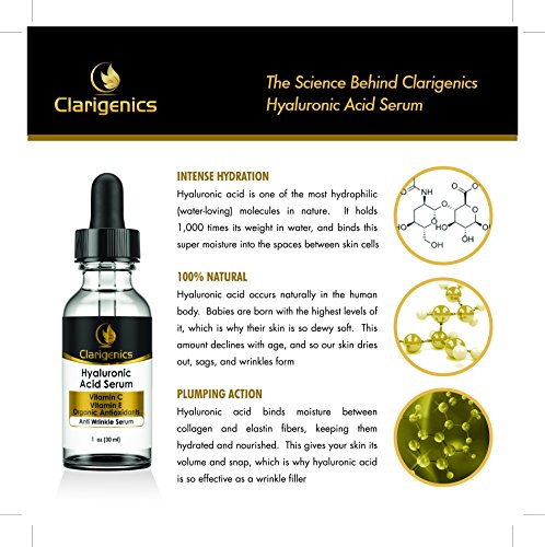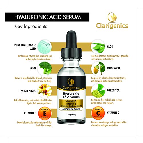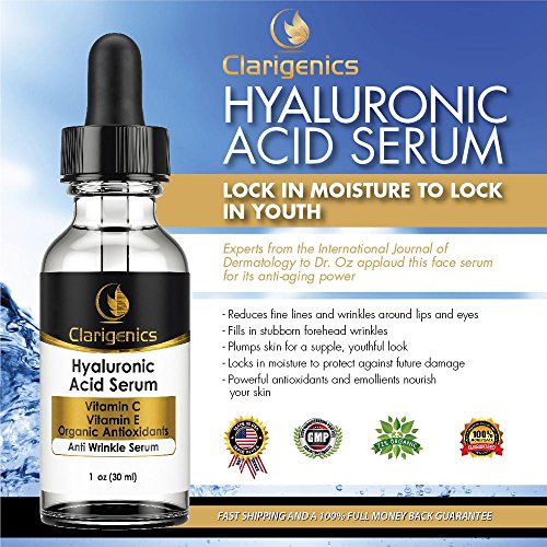 - Feature : HYALURONIC ACID SERUM WORKS! Dermatologist recommended as the best wrinkle fighter available. Plumps the skin and makes fine lines and wrinkles fade. Fills in crows feet, lip wrinkles, deep smile lines around the mouth, neck creases, and even those stubborn forehead wrinkles! / NO NASTY STUFF: your skin loves you, and now you can love it right back by not damaging it with harmful toxins. We use no parabens, phthalates, alcohol, or dioxanes in any of our products. / FEELS GREAT: our customers say they feel a gentle soothing of their skin and a smoother texture in just a few uses. Our serum is similar in consistency to aloe (almost like a gel) so it never runs and absorbs easily. The dropper bottle makes it super easy to apply without any waste. A little goes a long way! It also makes friends easily with your other skin care products, and actually helps pull your regular moisturizer deeper into your skin! / 100% NO WORRY GUARANTEE: Order now with complete confidence. Any issues and you get your money back right away, no questions asked. Simple and honest.