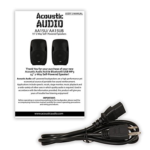 Acoustic Audio AA15UB 2-way powered Bluetooth USB MP3 speaker, 500 watts RMS and 1000 watts max, sensitivity is 101dB and 25-20,000Hz frequency response