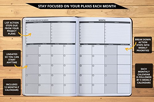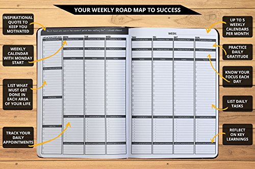 STAY FOCUSED EVERY DAY – Each undated monthly and weekly calendar highlight action steps due. Weekly calendars have Monday start date, letting you view an entire week's worth of tasks, appointments, daily gratitude and reflection.