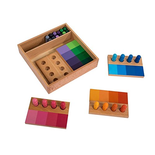 It contains: 24 beechwood skittles painted in four shades of each of the color red, yellow, blue, green, orange and purple; 6 wooden stands to hold each set of skittles and 6 wooden color boards with each of the shades from dark to light to match with the skittles. The material is contained in a two compartment wood box. It is a matching and sorting game using shades of colour to develop skills in visual perception and colour discrimination. The Colour Task provides an excellent opportunity to introduce vocabulary so that the child may learn the names for each of the colours and the associated descriptive terms. • Dimensions of Box: 11 x 11 Inches