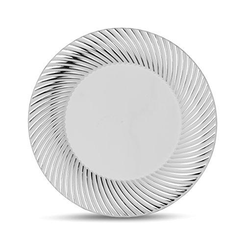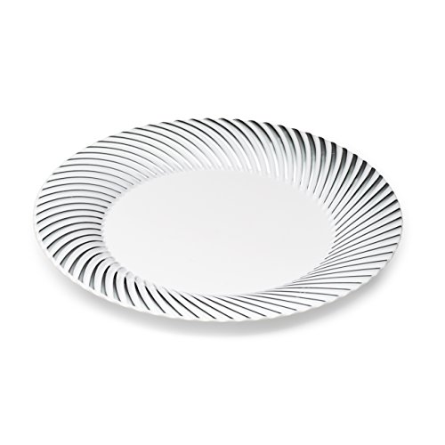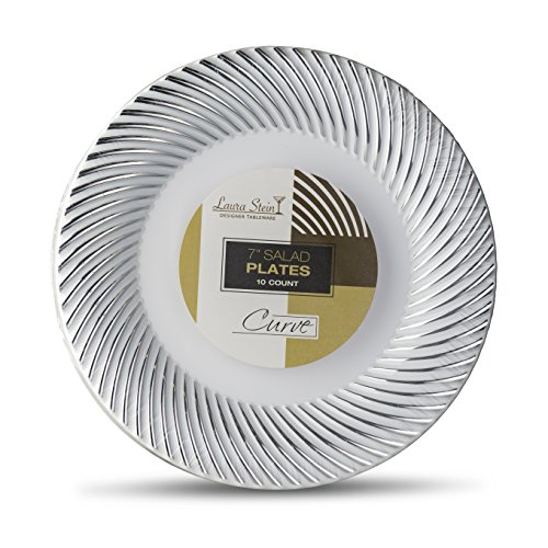 Laura Stein Designer Tableware Premium Heavyweight 7'' Inch White And Silver Rim Plastic Party & Wedding Plates Curve Series Disposable Dishes Pack of 40 Plates