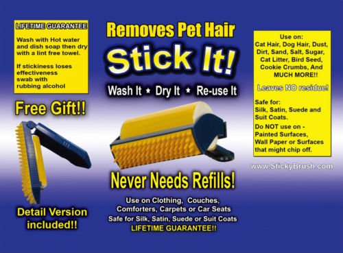 - Feature : The Sticky BuddyTM lint roller has the power of glue without the goo. / It easily removes pet hair, crumbs, lint and more without leaving a sticky residue behind. / Great for cleaning your clothing, bedding, furniture and car upholstery. / It even has little rubber fingers to reach deep into carpets to remove ground-in messes, Reusable - just rinse, dry and it's sticky all over again / Comes with medium version with cover and detail size version.