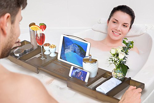 NEWEST DESIGN BATHTUB CADDY TRAY WITH THE BIGGEST EXTENDABLE SIDES UP TO 43 INCHES! Soap Holder is FREE! Just imagine soaking in hot water facetiming someone and watching your favorite movie or reading your favorite book. This amazing bathtub shelf, allows you to place a glass of wine and a cup of tea or coffee on your bathtub it and enjoy a luxurious, relaxing bath. Relax like a King!