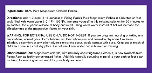 In the Netherlands lies the ancient Zechstein Seabed, unadulterated from contaminants and pollution for millions of years thanks to its subterranean isolation. It is from this seabed that magnesium chloride is mined from salt beds 2 miles beneath the earth's surface. Magnesium chloride, which contains naturally occuring and beneficial trace elements, is now available from Piping Rock as highly-concentrated flakes! Add this ancient mineral to your bath or foot soak for blissfully soothing refreshment for your body and mind. For adults, add 1-2 cups (8-16 ounces) of Piping Rock's Pure Magnesium Chloride Flakes to a bathtub or foot soak filled with warm water (101°F - 105°F). Immerse yourself in this relaxing solution for around 20 minutes. Using warm water instead of hot will increase the effectiveness of the magnesium flakes on your skin.Feature
