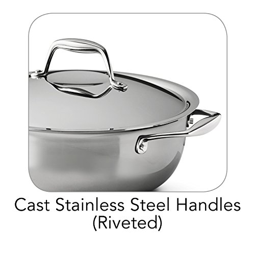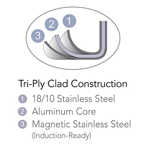 Tri-Ply clad construction (18/10 stainless steel, aluminum core, magnetic stainless steel) for quick and even heat distribution, without hotspots