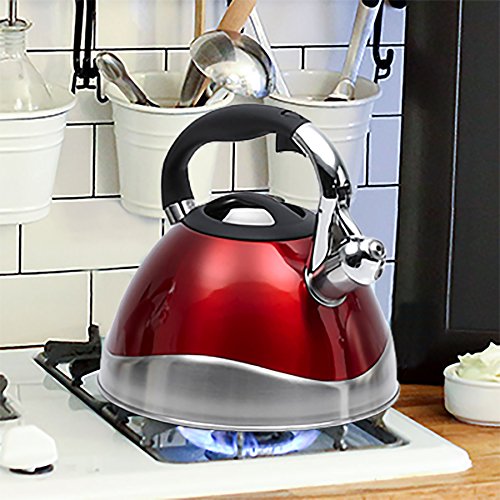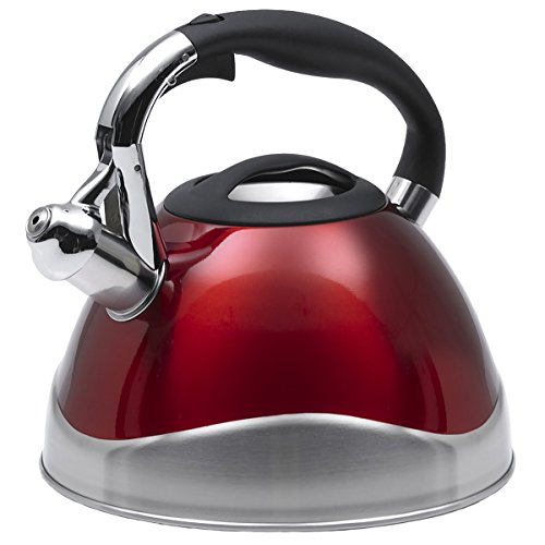 Crescendo 3.1 quart stainless steel whistling tea kettle with an aluminum capsulated bottom for even heat distribution and ergonomic stay cool handle cranberry color.
