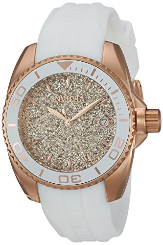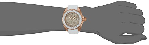 Rose gold glitter dial with rose gold tone hands and hour markers; mineral crystal; 18k rose gold ion-plated stainless steel case; white silicone strap