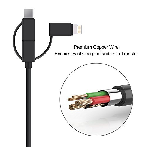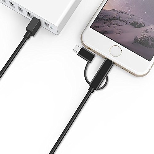 3 in 1 Lightning & Micro USB Charging Cable with 8 Pin Lightning & Micro USB 2.0 &Type-C Ports for iPhone iPad Samsung Galaxy Tab Note HTC Motorola Kindle Fire Nokia LG Sony Blackberry(Black)