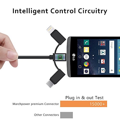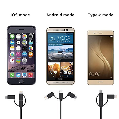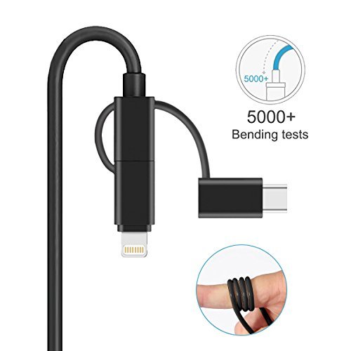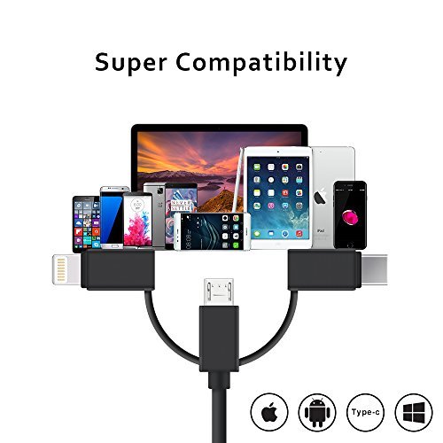 【Multi-Compatible Design】There is no need to carry too much different cables with this cord in hand! 3 in 1 design (Micro USB Connector, 8 Pin Lightning Connector, and Type C) makes the cable widely compatible for both Apple and Android devices such as iPhone 7/ 7 plus 6/6 plus, iPhone 5/5s/SE, iPad Mini, iPad Air/Pro, iPod touch 5, Nano 7, Google Nexus, Samsung Galaxy Tab/Note, HTC, Motorola, Amazon Kindle, Kindle Fire, Nokia, LG, HP, Sony, Blackberry, and more.