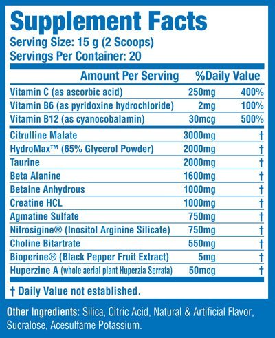 -. Feature : No caffeine, proP.R.Ietary blends, or artificial colors / Scientifically dosed HydroMaxTM, NitroSigine®, and Agmatine Sulfate / Unrivaled pumps, endurance, and focus*