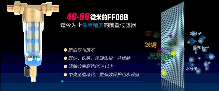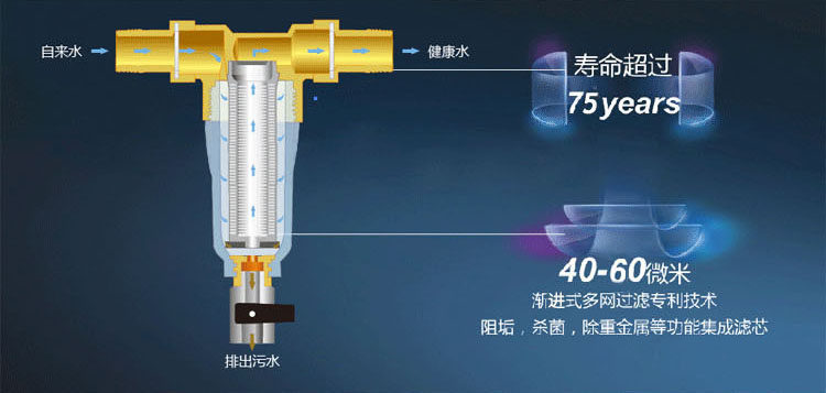 全屋过滤器的滤网密度为40微米,比头发丝都还小的孔径,当把过滤器安装在水表后,能阻挡住自来水中的颗粒性杂质(注:自来水在城市管网输配水过程中,由于城市管网、屋顶水箱等的老化、破损而造成的二次污染,使水中带有如铁锈、泥沙、颗粒物、悬浮物、石棉纤维、红线虫等物质)让自来水恢复到出厂水质。