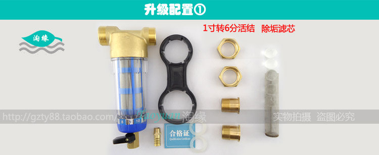 尊贵款①:主机1台+安装扳手1把+排污嘴+6分活接1对+除垢滤芯1支+原装备用滤网1支(100元)←6分口