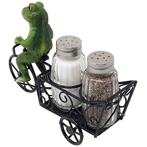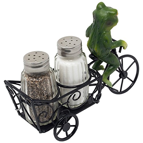 Decorative Frog Riding Bicycle Cart Salt and Pepper Shaker Set Display Stand Figurine for Whimsical Restaurant Dining Room Table Centerpieces or Cottage Kitchen Decor Spice Racks As Housewarming Gifts