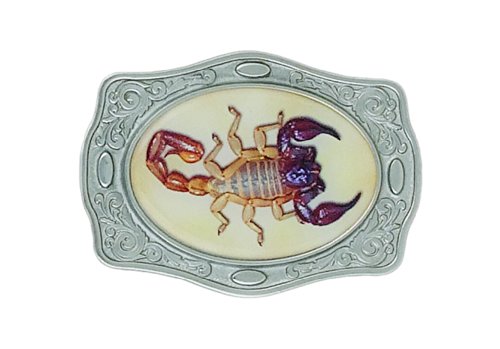 Product Description This silver belt buckle features a scorpion at its cener. It is bordered by filigree and has a polished look. This belt buckle is made to turn heads your way! 0