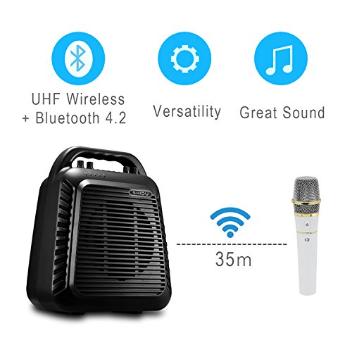 ULTRA PORTABLE: Lightweight and compact design make this wireless Bluetooth PA system is very easy to carry; UHF Karaoke Wireless Microphone System support synchronous Karaoke.