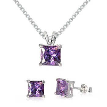 -. Title : P.R.Incess Cut Simulated Amethyst Stone Sterling Silver Necklace & Earrings Set