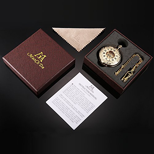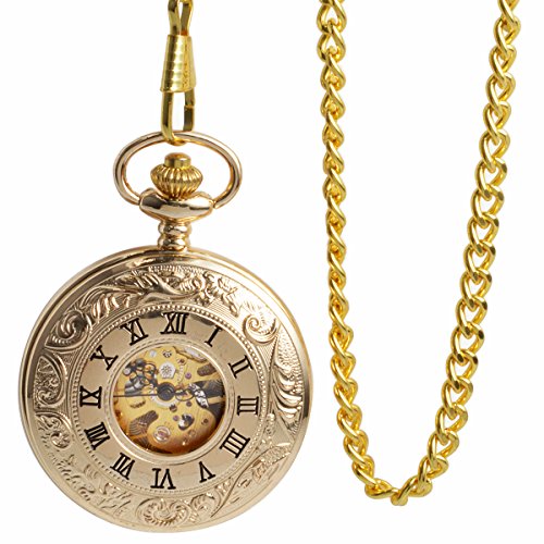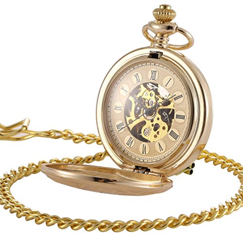-. Feature : 1. SPECIAL DESIGN - Elegant double hunter design, Golden engraved hollow case, Special skeleton mechanical dial with golden movement, gold dial with black Roman numerals. Looks very Elegant, Smart, Vintage and fashionable! / 2. GOOD QUALITY - 100% brand new with excellent workmanship, Precise mechanical movement, Elegant case with long chain, Good touch feeling. Fit for casual environment and business occasion. For safety, the front face is made of Acrylic instead of Glass. / 3. BRTTERY NEEDLESS - Mechanical hand-wound movement, No need to use battery. Twisting the top button on the spin, tightening a walk for 24 hours. Please wind up the watch before every usage, Keep the watch away from magnet to avoid making the watch stop working. / 4. FASHION ACCESSORY - Attractive vintage design with unique skeleton dial, steampunk Cosplay, Add undeniable style and class to your daily life and fashion, An "Eye-catcher" at the suit, vest, pants or dress / 5. PERFECT CHOICE - Come in with good quality gift box, With a microfiber cloth for daily easy cleaning. Perfect gift for your love and family or yourself, Best Valentine's day Gift, Superb Christmas Gift, Birthday Gift, Wedding Gift etc.