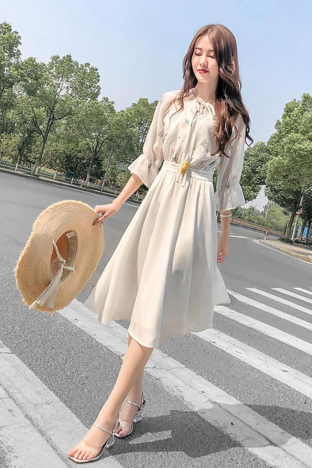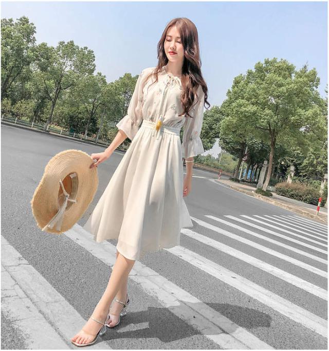 女性の服 Vネック 長袖 シフォン ホワイト ロングワンピース