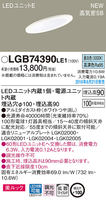 ●寸法(mm):埋込穴φ100・埋込高90