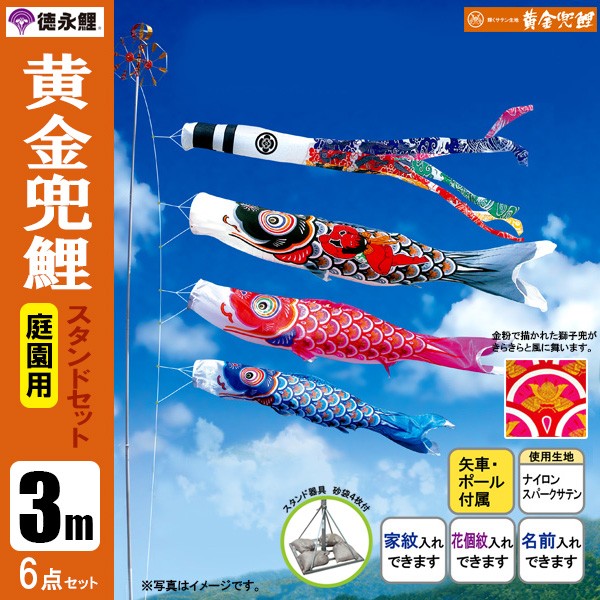 | 黄金兜鯉 庭園用大型鯉のぼり スタンド砂袋式ポール付セット | 1.5m鯉3匹 | 2m鯉3匹 | 3m鯉3匹 3m鯉4匹 3m鯉5匹 | 4m鯉3匹 4m鯉4匹 4m鯉5匹 |