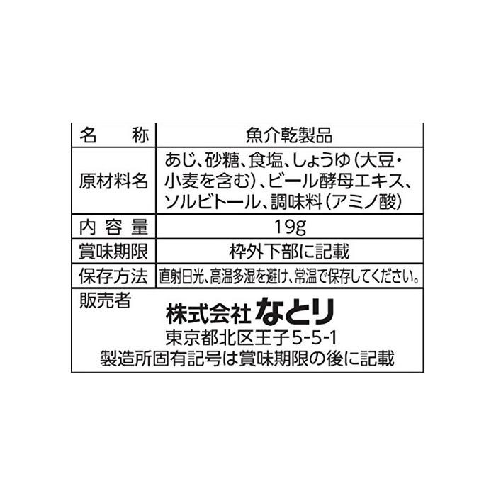 원재료:전갱이,설탕,식염,간장(대두 밀을 포함한다)고, 맥주 효모 엑기스,솔《비토루》,조미료(아미노산)