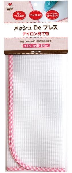 メッシュ状でプレス部分が透けて見えるのでズレにくく、スチームの通りも良いのでプレス効果が高いあて布です。生地に直接アイロンが当たらないのでテカリを防ぎます。 |
