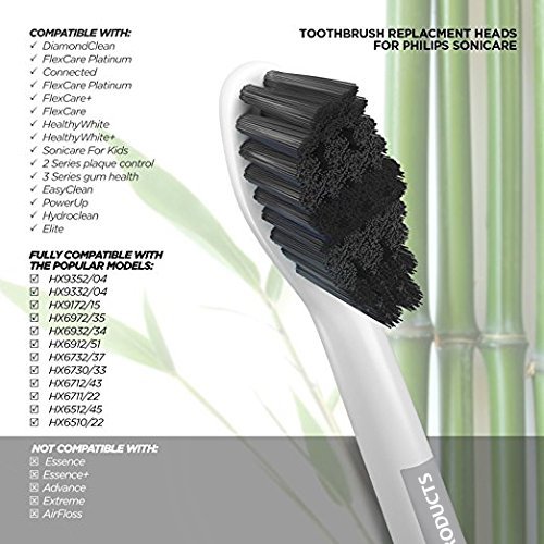 -. Feature : SONICARE TOOTHBRUSH HEADS WITH BAMBOO CHARCOAL INFUSED BRISTLES FOR A SPARKLING SMILE AND FRESH BREATH: Our toothbrush heads are the first ones to combine the sonic motion with bamboo charcoal infused bristles. The bamboo charcoal absorbs all kinds of toxins and bacteria in the mouth so you can have a sparkling smile and fresh breath / ROUNDED BRISTLE TIPS FOR A SUPERIOR GUM CARE: Unlike many competitors our Sonicare toothbrush heads come with rounded tips. This way they can easily reach all the difficult spots in your mouth without hurting your gums in the process and enamel in the process. / 8 AIRTIGHT MINI PACKS FOR A MORE HYGIENIC STORAGE: Our 8 Sonicare toothbrush heads come packed in airtight mini packs, so you can store the rest of your brushes until you need to use them. Every brush comes with its own protective cap to make sure it's clean and safe for use, at home or during trips. No more reusing the old caps! / 100% PURCHASE SATISFACTION OR YOUR MONEY BACK: We've worked hard to bring you our new premium bamboo Sonicare replacement heads and we are sure that you'll love them! If you don't, you are covered by our money back guarantee. This means that if you don't like how our brushes feel in your mouth or you have some other problem, we will give your money back. Try our product risk free! / Compatible with HX6011/6013/6014/6016/6017/6311/6412/6432 HX6711/6730/6731/6732/6733/6780/6782 HX6902/6921/6930/6932/6942/6972/6982/6993 HX6100/HX6150/HX6411/HX6431/HX6500/HX6511 HX6530/HX6711/HX6730/HX6731/HX6732/HX6780 HX6781/HX6782/HX6902/HX6910/HX6911/HX6912 HX6921/HX6930/HX6932/HX6933/HX6942/HX6952 HX6982/HX9332/HX9382/HX9342 Sonicare R710 Sonicare R732 Sonicare RS910 Sonicare RS930 Sonicare RS950