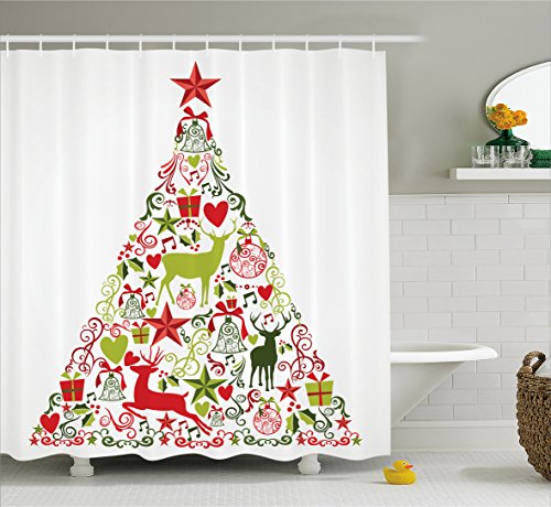Ambesonne Christmas Decorations Collection, Merry Christmas Themed House Decor Popular New Year Ornaments and Star Tree Topper, Polyester Fabric Bathroom Shower Curtain Set with Hooks, Multi