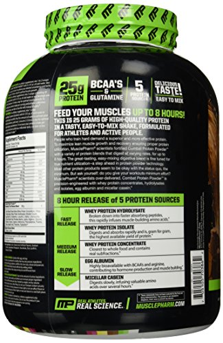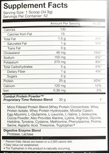 This is 25 grams of high quality protein in a tasty easy to mix shake, formulated for athletes and active people. People who train hard demand a superior and more effective protein. To maximize muscle growth and ensure proper protein utilization, MusclePharm scientists fortified Combat Powder® with a variety of protein blends that digest at varying rates, for up to 8 hours. The great-tasting, easy-mixing digestive blend is fine tuned for true nutrient utilization—a step ahead in protein powder technology. Most supplement companies seem to be okay with the status quo, the minimum. But ask yourself: do you give your workouts minimum effort? MP scientists over-delivered. Combat Powder is precision-engineered with whey protein concentrates, hydrolysates and isolates, egg albumen, micellar casein. Whey Protein Isolate: WPI digests and absorbs rapidly and is, gram for gram, the highest available yield of protein. Partially hydrolyzed whey protein: Broken down into faster-absorbing peptides, this rapidly infuses muscle-building amino acids. Micellar Casein: It digests slowly, infusing valuable amino acids over several hours. Studies show this may protect muscle tissue. Whey Protein Concentrate: Closest to whole food and contains real subfractions. Egg Albumen: Highly bioavailable and tolerated by most individuals, egg albumen is high in BCAA and arginine, contributing to hormone production and muscle building. Digestive Enzyme Blend: 60mg added to aid in protein digestion and absorption. Added BCAA’s Glutamine: The BCAAs l-leucine, l-isoleucine, and l-valine maintain, repair and build muscle tissue. L-leucine has been suggested to support protein synthesis and muscle growth. L-Glutamine has been surmised to support healthy immune systems. Some suggest L-Glutamine helps with recovery. Combined with Glutamine, it also fortifies muscle-building.Feature