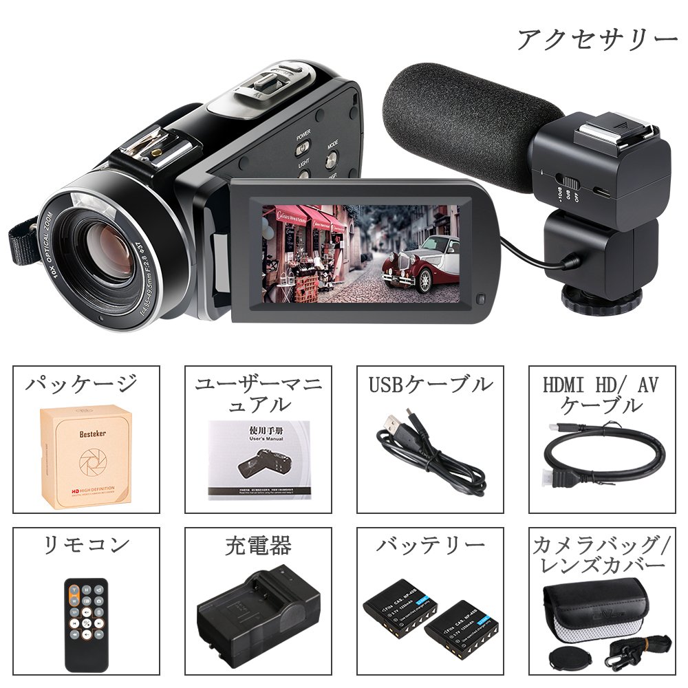 Package: Light weight and portable Besteker camera, rechargeable 3.5mm external metal microphone, HDMI cable, USB cable, lithium ion battery, USB charger, remote control, camera bag, user manual.