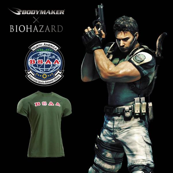 最強格闘スポーツブランド【BODYMAKER】と最怖のホラーゲーム【BIOHAZARD】の天下無双のコラボ企画!バイオハザード世界観をスポーツメーカーのノウハウを詰め込んで具現化したTシャツが新登場!BIOHAZARFD(バイオハザード)の世界観をリアルに具現化し、アクションシーンを想定したウエアを、スポーツブランド「BODY MAKER(ボディメーカー)」がスポーツメーカーのノウハウを詰め込み込んで開発し限定発売! 全ラインナップは、BIOHAZARDシリーズ内組織「S.T.A.R.S.」「BSAA」「Umbrella」の世界観とリンクさせ、特殊部隊としてのイメージを具現化したスポーツインナー、スポーツウエア、メッシュキャップ、バックパック、トレーニンググローブなど全11種を発売! 幅広いラインナップで世界中のBIOHAZARDファンのスポーツシーンにマッチングできるデザインと機能性になっています。