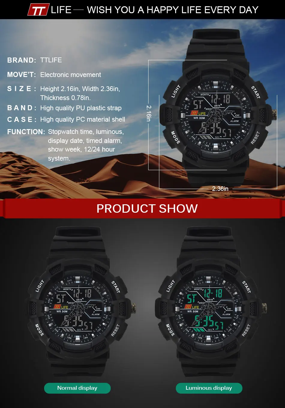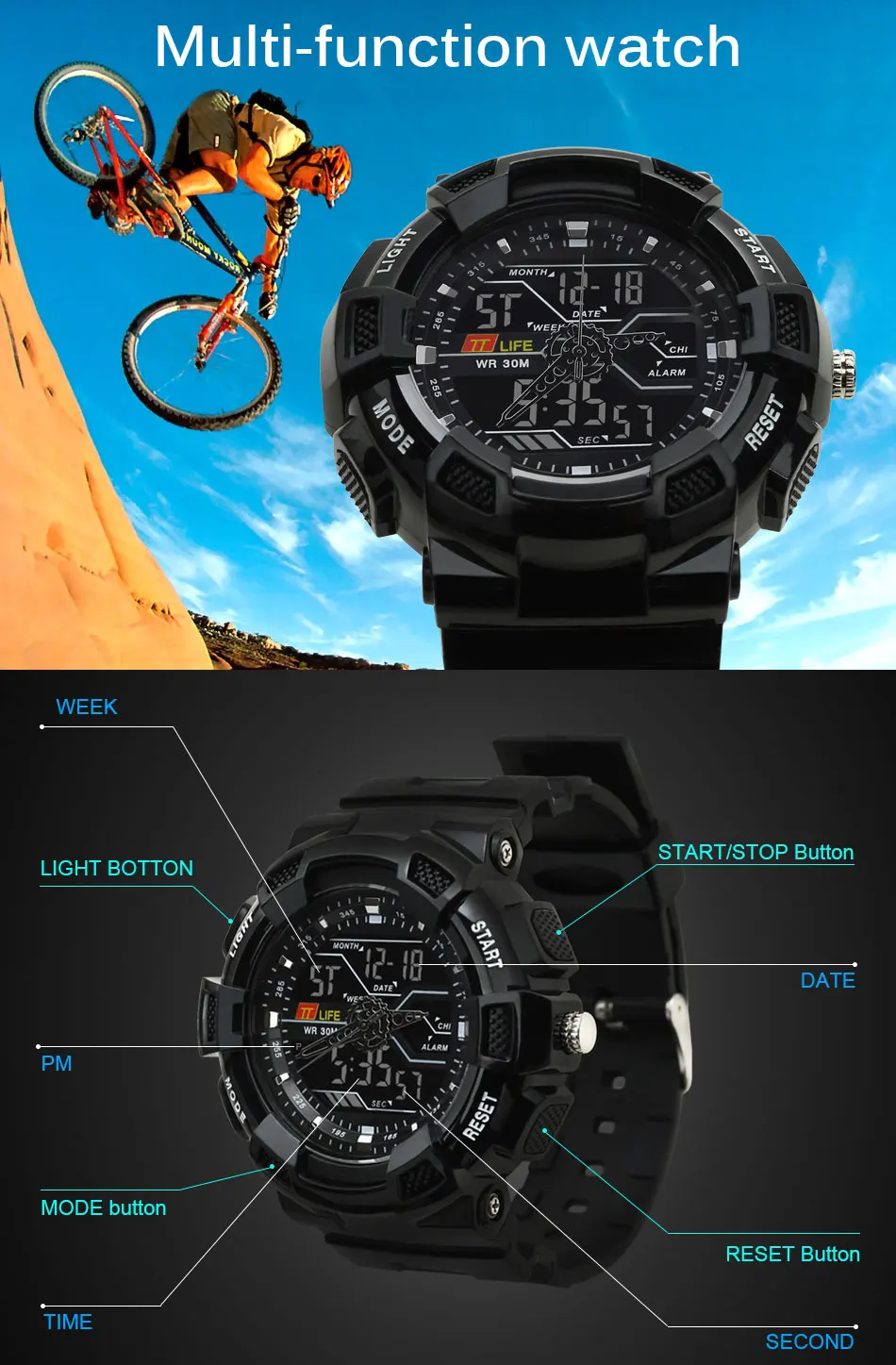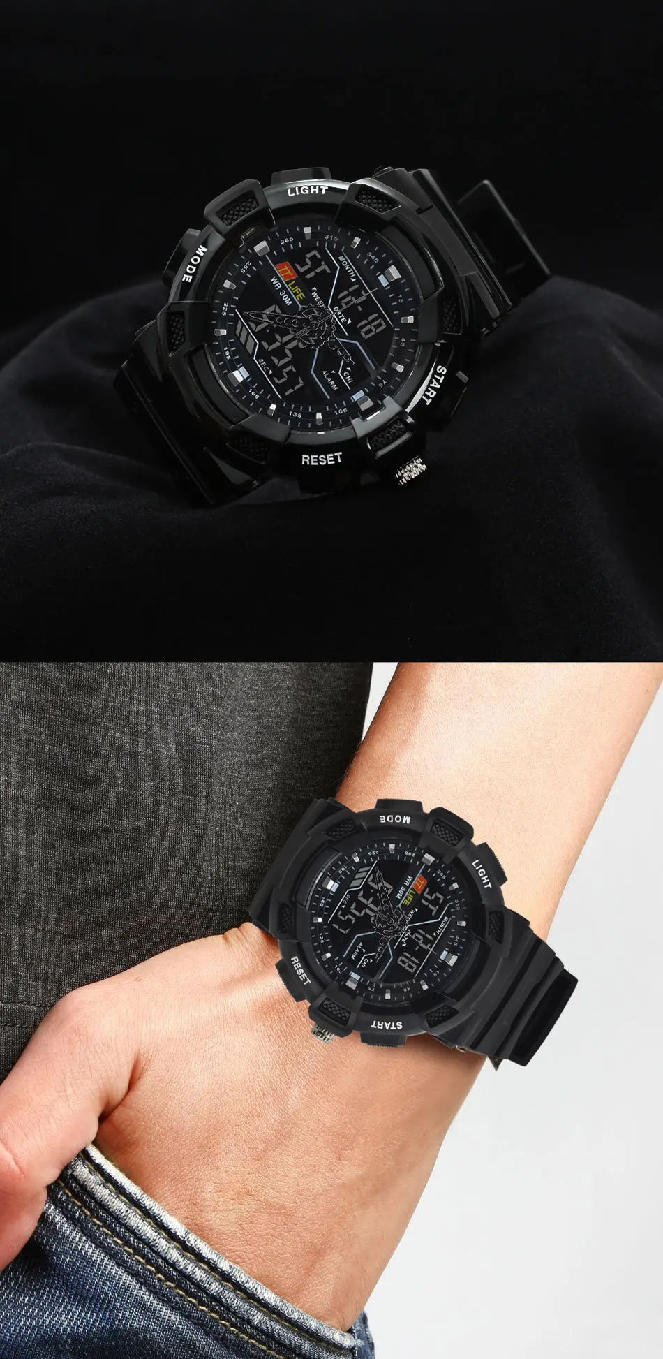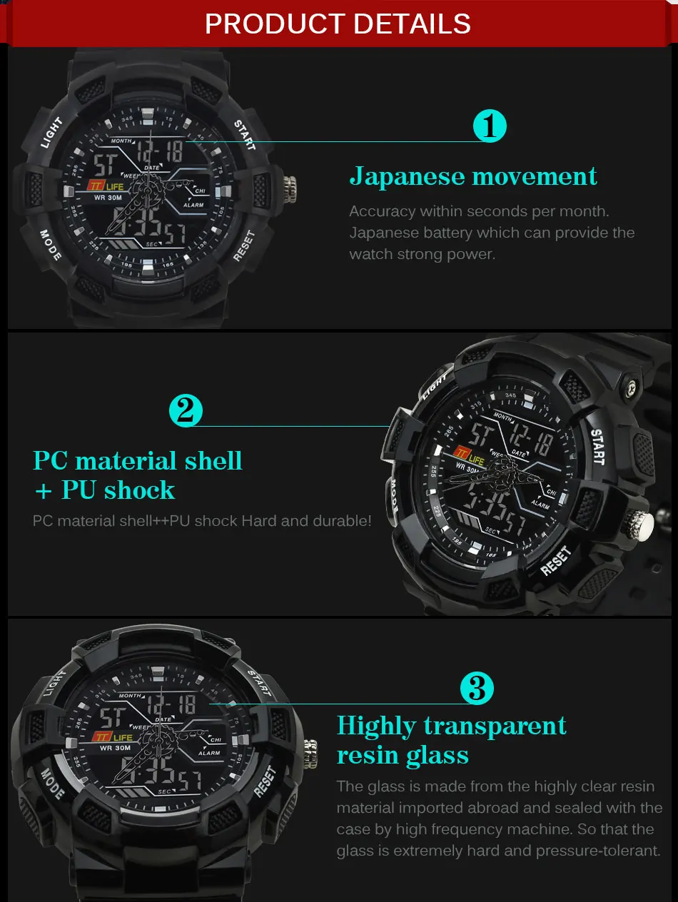 - 특징: 경보,뒤 빛,물 저항하는,충격 방지,기초시계,달력을 완료하십시오,수영,크로노그래프,자동 날짜,발광 다이오드 표시