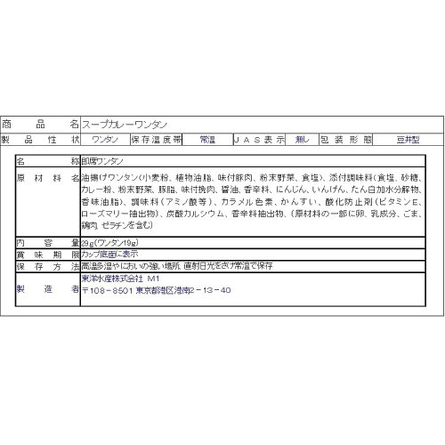 原材料:油揚げワンタン(小麦粉、植物油脂、味付豚肉、粉末野菜、食塩)、食塩、香辛料、砂糖、粉末野菜、豚脂、味付挽肉(豚・鶏)、醤油、たん白加水分解物、にんじん、いんげん、植物油、調味料(アミノ酸等)、カラメル色素、かんすい、酸化防止剤(ビタミンE)、炭酸カルシウム、(原材料の一部に卵、乳成分、ゼラチンを含む) 標準栄養成分表:1食(26g)あたり エネルギー 124kcal、たんぱく質 2.7g、脂質 7.1g、炭水化物 12.4g、ナトリウム:1.0g(ワンタン・かやく0.2g、スープ0.8g)、食塩相当量 2.5g