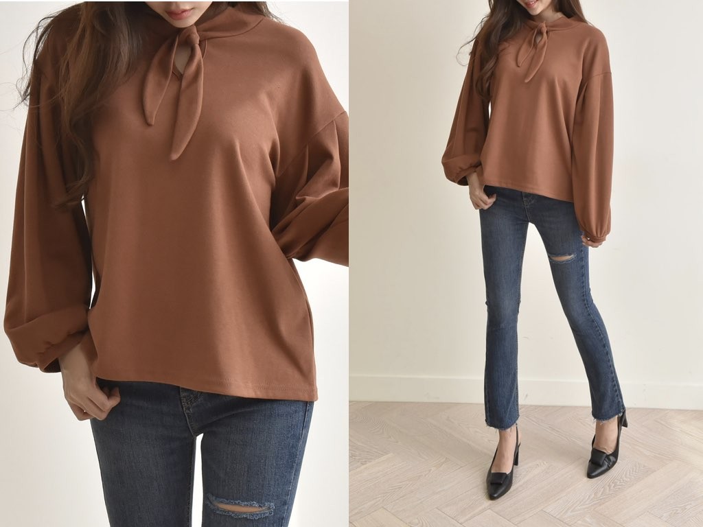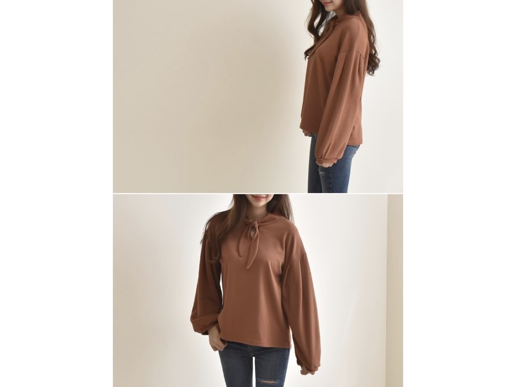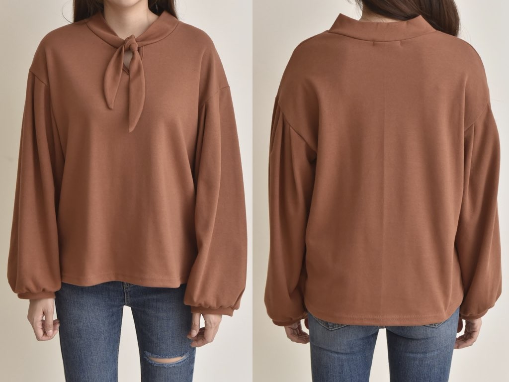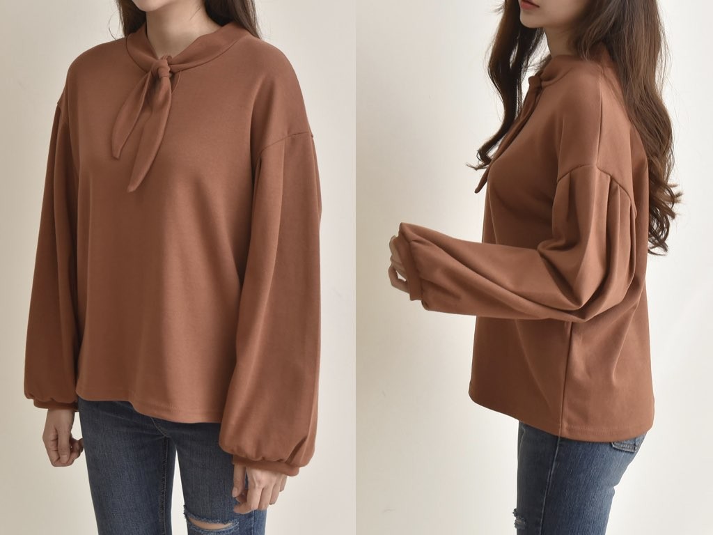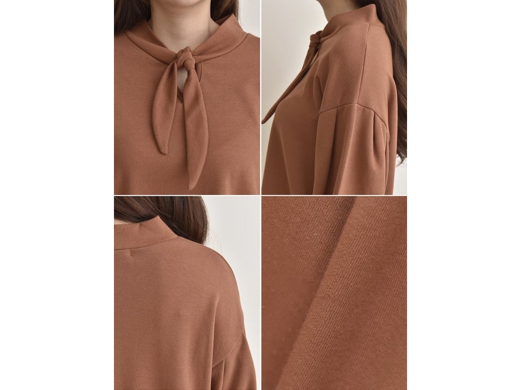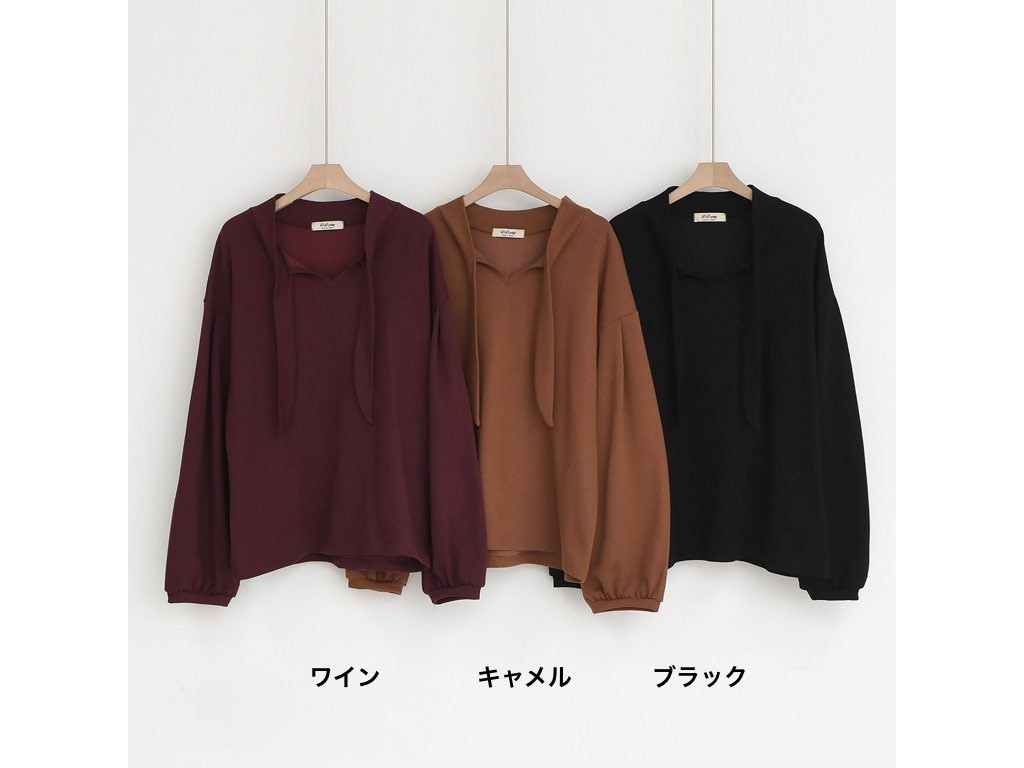 リボン付きのトップスです。さらりと着れてインナーとしても重宝するアイテムです。商品は、とても丁寧なつくりとなっています。1.基本情報色:3色展開(ワイン/キャメル/ブラック)サイズ:Free素材:綿45%、ポリエステル55%製造国:Korea2.サイズ情報肩幅:52cm身幅(胸断面):53cm 腕の長さ:50cm 着丈(前):60cm (サイズは計る方法に応じて±2〜3cmの誤差があります。ご了承お願い致します)モデル着用サイズ:F※着用モデル(163cm、体重47kg、足のサイズ24.5cm)3.その他の情報厚み:中間透け感:なし伸縮性:中間裏地:なし洗濯方法:洗濯[注意事項]お取り寄せ商品は、海外より仕入れるため納品まで約10日前後いただきます。また店舗でも販売しており、在庫切れになる場合もございます。ご了承お願い致します。