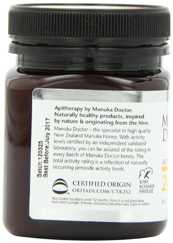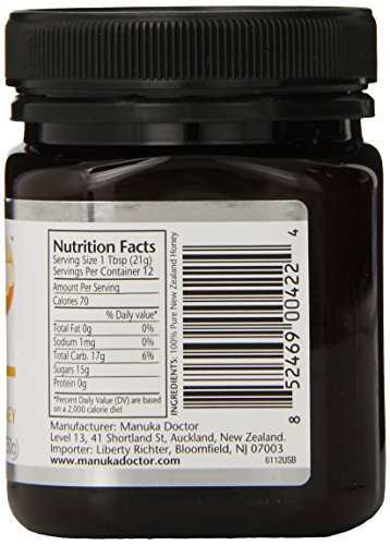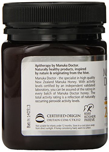Manuka honey is created by bees who feed on the nectar of the Manuka flower, found in New Zealand; the ingestible and topical qualities and benefits have been renowned for many years. Manuka Doctor Bio Active Manuka honey is a part of the Manuka Doctor Apitherapy collection using the highest grade Manuka honey. This offers consumers a tasty way to get natural health benefits for their wellbeing. Not only do we offer consumers independent laboratory rated Manuka honey, an independently certified country of origin guarantee, Kosher certification, and the New Zealand Ministry for Primary Industries certified Risk Management Program, but we also provide three size variations, four bio activity ratings (10+, 15+, 20+, 24+), and four Infused Honeys (Lemon, Ginger, Aloe Vera, and Glucosamine). While Manuka honey is widely known for its health and wellbeing benefits, this product is the perfect alternative to your regular sweeteners. Whether you use our Manuka Doctor Infused Manuka honeys or the 100% Bio Active Manuka varieties, you will taste and feel the difference by using a healthy and delicious alternative.Feature