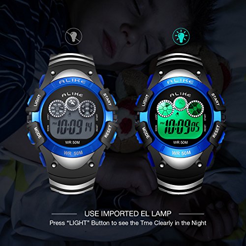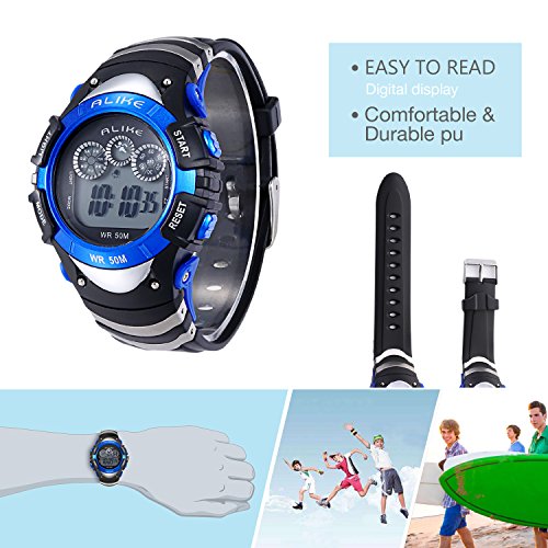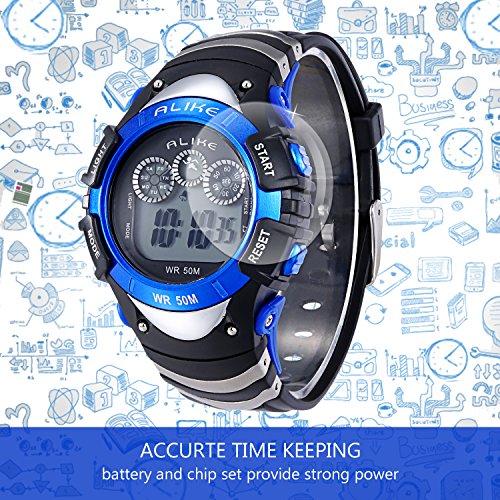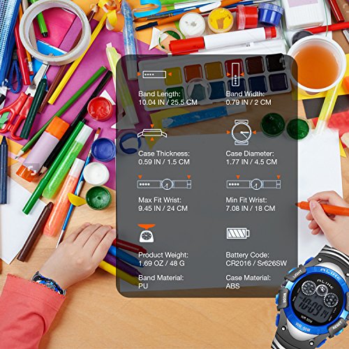 -. Feature : FASHIONABLE SPORT DESIGN: week time window, shock-resistant rubber case, soft imported watch band with anti-drop and anti-wear design for kids. / DIGITAL SPORTY WATCH: 12/24H time mode, super easy to read, stop watch, LED back light, calendar week / month / date and alarm functions make it perfect for all kind of sport and daily use, such as running, climbing, fishing, ectDIGITAL WATCH: 12/24H time mode, kids can easy to read it, stop watch, LED back light, calendar week / month / date and alarm functions make the digital watch perfect for all kind of sport outdoor and daily use. / LED LIGHTS: Fashionable sport dial design for kids playing outdoor. Use excellent Colorful LED lights, just press the back light button, children can clearly see the digital watch time at night. / PRECISE TIME KEEPING: digital electronic movement, 1/100 second chronograph provide precise and accurate time keeping for kids. / WATERPROOF: the blue cool LED fashion waterproof wristwatch with 50 M water resist, support to swim and bathe underwater. Please DONOT press any buttons underwater and keep the blue kids watch away from steam and hot water.