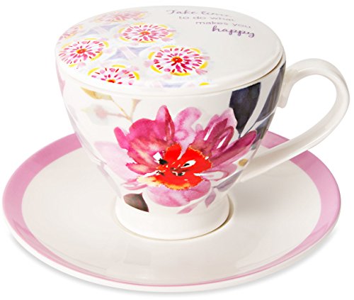 -. Binding : Kitchen -. Brand : Flora by Stephanie Ryan -. Color : Pink -. EAN : 0664843872219 -. Feature : Lid has a sweet sentiment and will keep your tea Warm while you're away / Cute and affordable friend birthday gift / Comes in a protective white box / Hand wash recommended, microwave safe / Original designs creatively developed in Upstate, NY -. Label : Flora by Stephanie Ryan -. Manufacturer : Flora by Stephanie Ryan -. Model : 87221 -. MPN : 87221 -. NumberOfItems : 3 -. PackageQuantity : 1 -. PartNumber : 87221 -. ProductGroup : Kitchen -. ProductTypeName : KITCHEN -. Publisher : Flora by Stephanie Ryan -. Studio : Flora by Stephanie Ryan -. Title : Flora by Stephanie Ryan 87221 Take Time To Do What Makes You Happy Three Piece Saucer Lid and Tea Cup Set with Pink Floral Design, Pink -. UPC : 664843872219