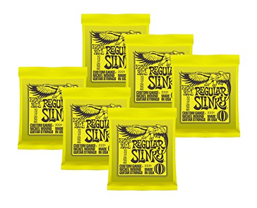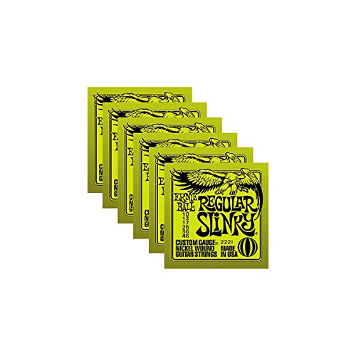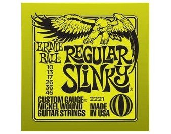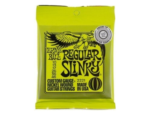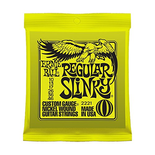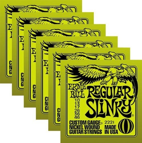 Studio : Ernie Ball Publisher : Ernie Ball Product Description Gauges 10-13-17-26-36-46.Ernie Ball 2221 Regular Slinky Electric Guitar Strings feature nickel-plated steel wire wrapped around tin-plated, hex-shaped, steel core wire. Slinky strings provide vibrant, bright, lasting tone and reduce fret wear. This weight balances maximum response from your pickups with playability and bendability. Ernie Ball replacement strings are precision manufactured to the highest standards and most exacting specs to assure consistency, optimum performance, and long life. Ernie Ball is the pioneer of rock and roll guitar strings. Jimmy Page, Eric Clapton, Steve Vai, and Slash are among the long list of Slinky players...... 0