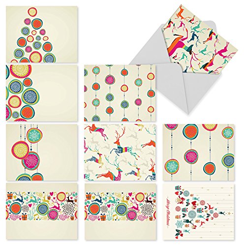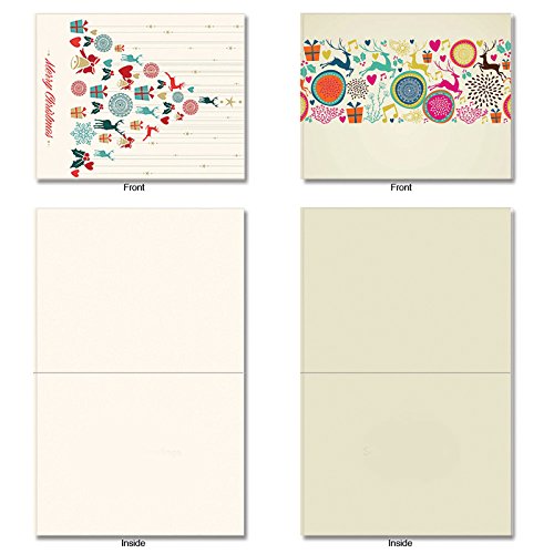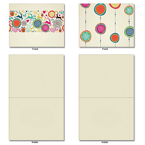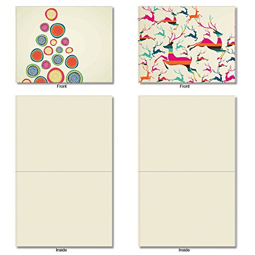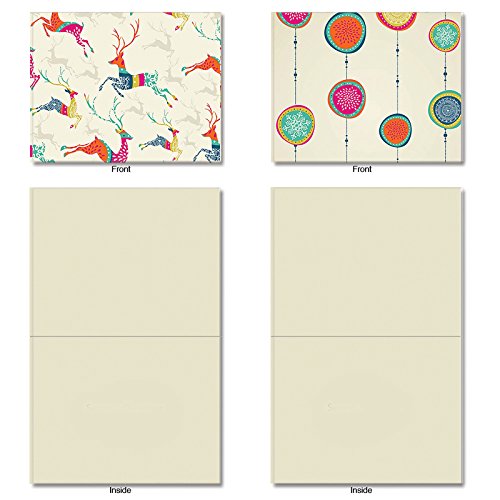 Contemporary holiday trimmings and leaping reindeer send your merry messages dashing on their way. Because they are Blank Note Cards, they have many uses from sending a personal greeting or invitation to an after-party thank you. These notecards look great framed, too! Try framing them individually, or grouping several in a collage frame, to create visually appealing wall decor.