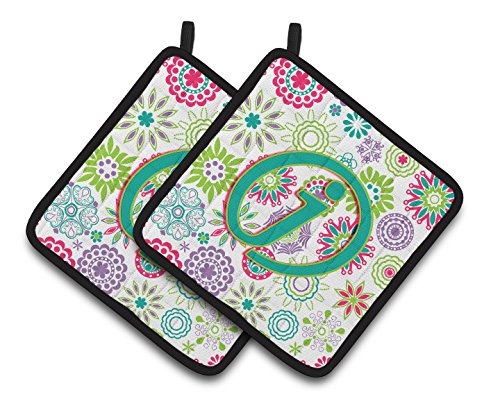 Caroline's Treasures Letter J Flowers Pink Teal green Initial Pair of Pot Holders CJ2011-JPTHD, 7.5HX7.5W, Multicolor