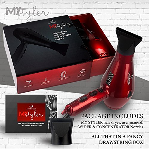 ★ Get ready to enjoy frizz-free hair thanks to the Magnifeko Hair Dryer ★Professional Hairdresser RecommendedThis styling professional hair dryer meets the salon shop high standard tools to dry your hair and create glamorous hairstyles to look your best. Our powerful Magnifeko blow dryer features ionic technology that neutralizes positive charges in the air to calm static electricity and its 2300W of power, this hair dryer will dry your in a snap.