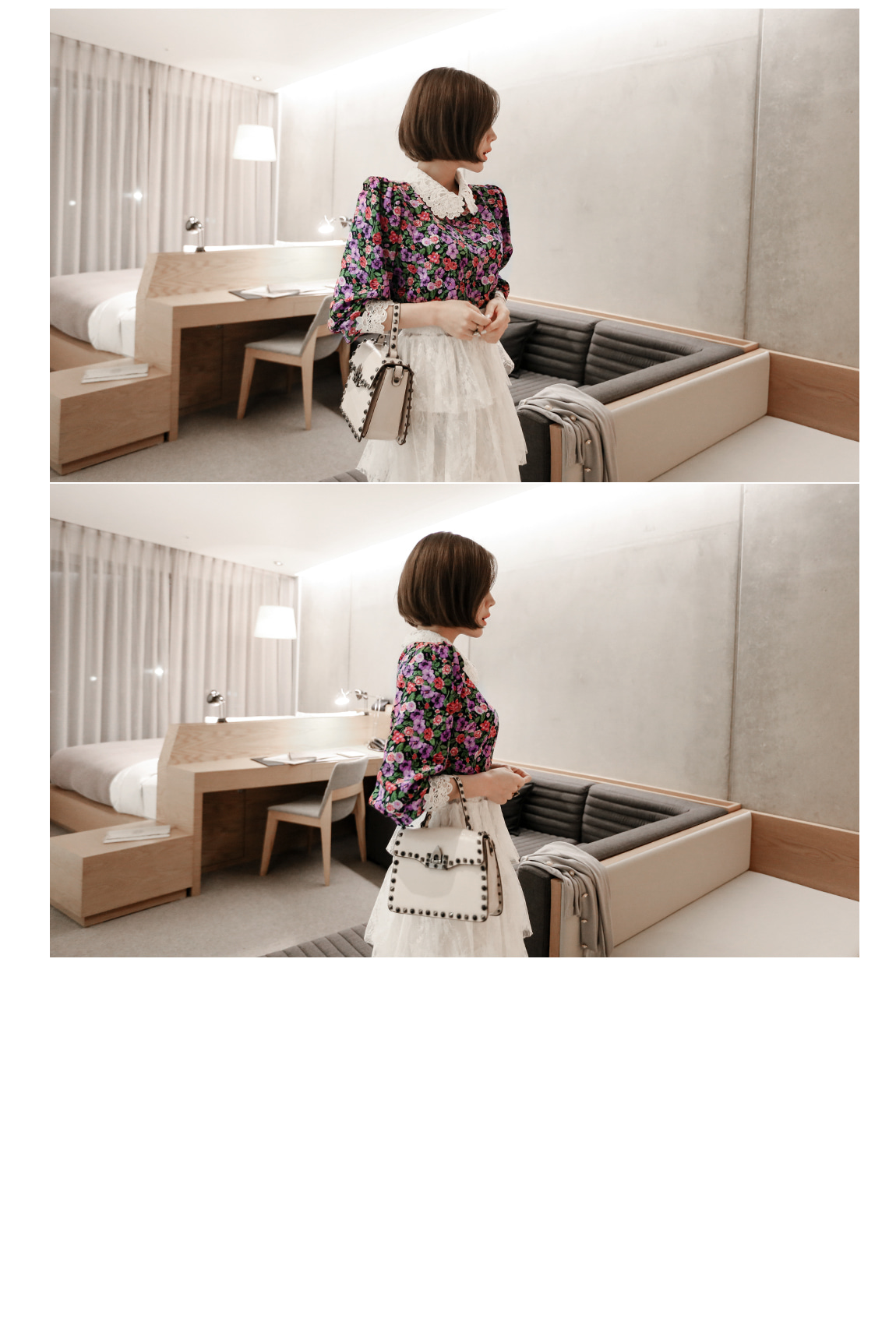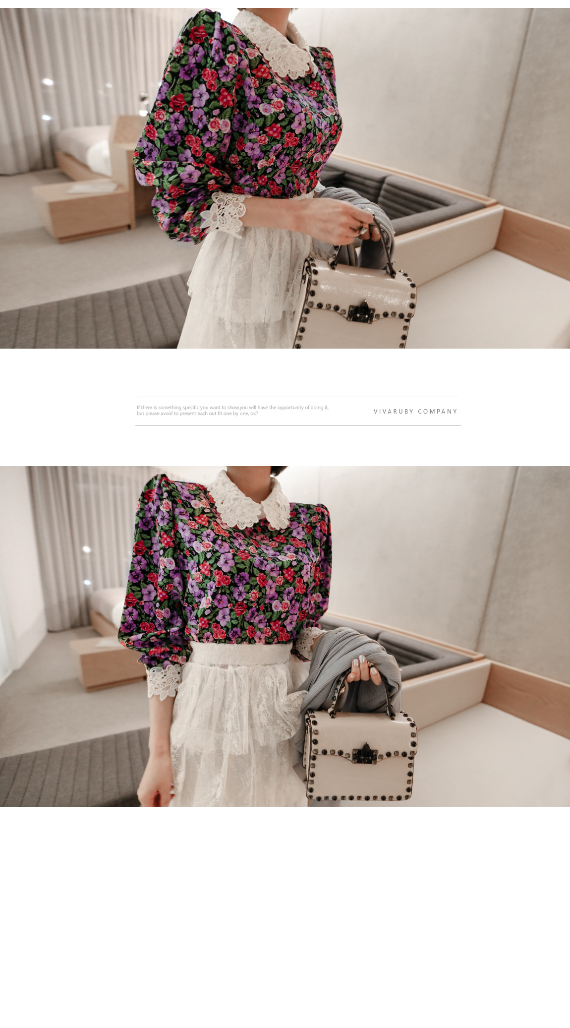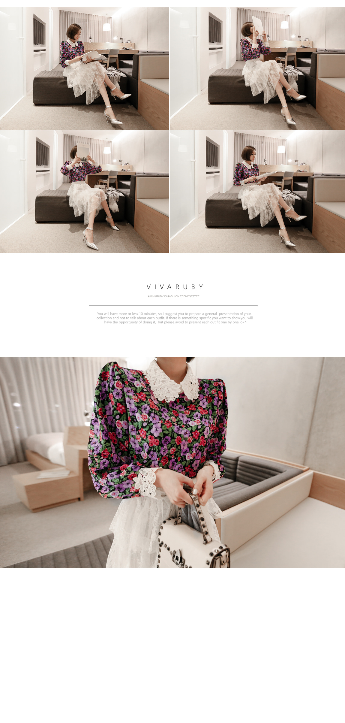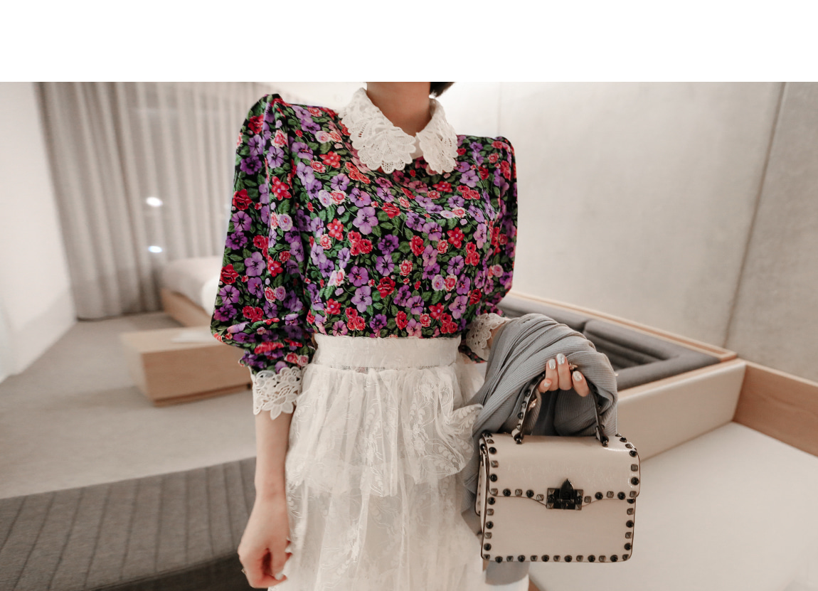 全体的なフラワーパターンでロマンチックなポイントを与え、