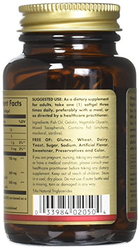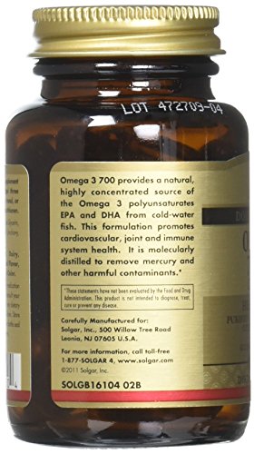 ReleaseDate : 2015-06-22 Studio : Solgar Publisher : Solgar Binding : Health and Beauty Product Description Omega-3 700 provides a natural, highly concentrated source of the omega-3 polyunsaturated EPA and DHA from cold-water fish. Promotes cardiovascular, joint and immune system health. Molecularly distilled to remove mercury and other harmful contaminants. Gluten, wheat and dairy free. 0