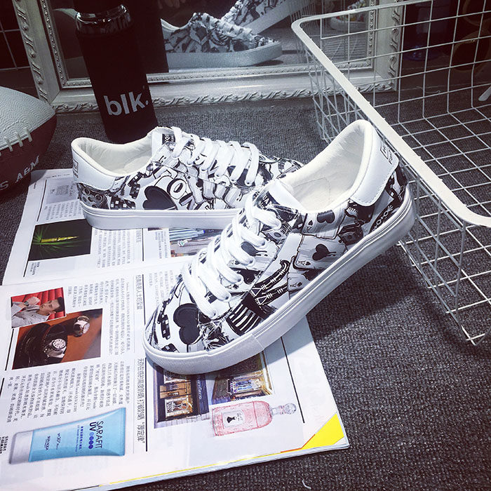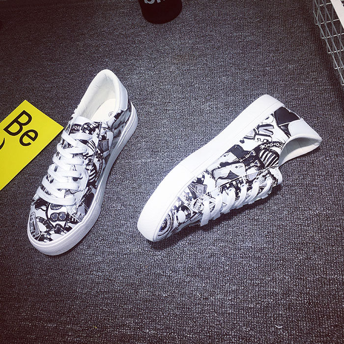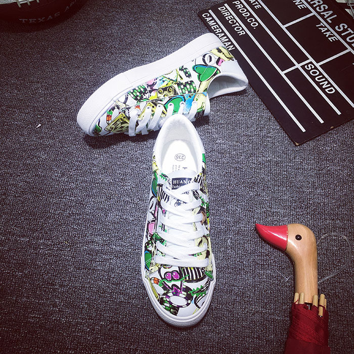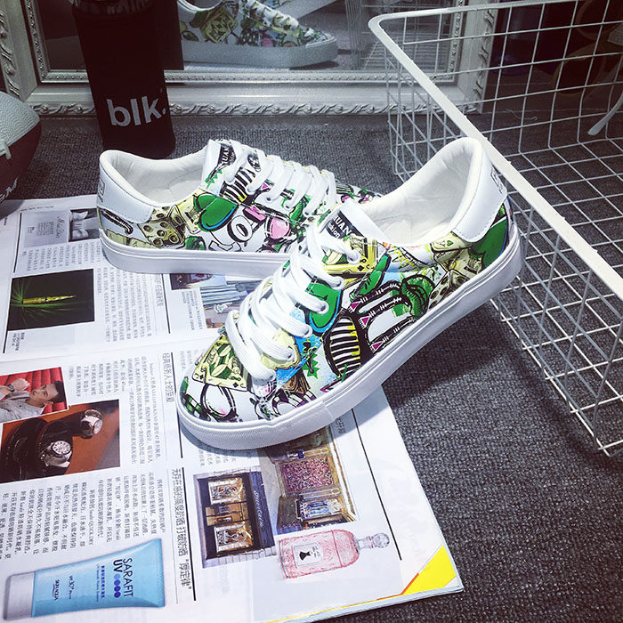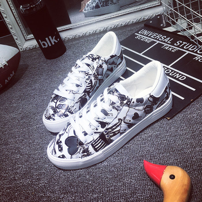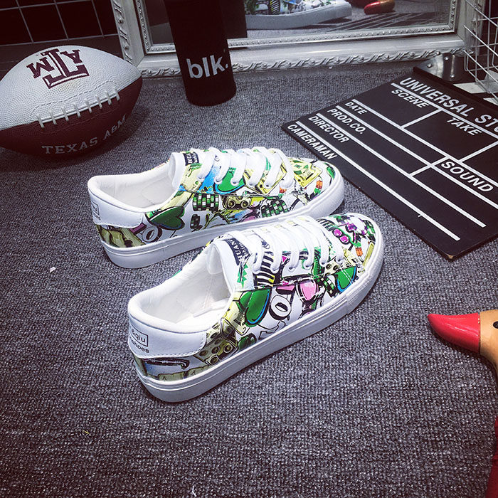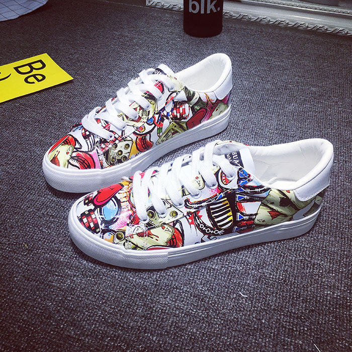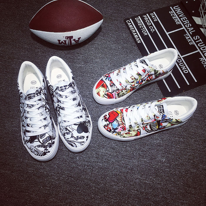 春季涂鸦百搭厚底帆布鞋韩版女鞋学生平底板鞋休闲鞋皮面小白鞋潮