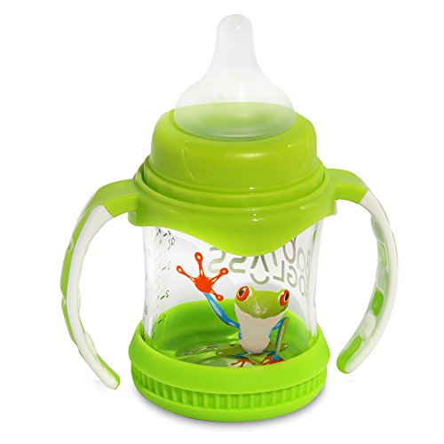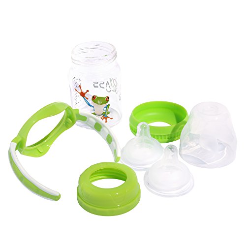 - Feature : EASY GRIP HANDLES. Ergonomic bottle design is easy for parents and babies to grasp. Leak proof design when screwed on firmly. Small and great for travel. / EASY TO CLEAN! Wide mouth design makes filling and cleaning easier. Wide neck nipple for easier latch. / NO PLASTIC OR METALLIC AFTERTASTE. Made from high medical grade borosilicate glass (Pyrex). Borosilicate glass is not your normal glass. It's strong and durable and resistant to breaking. Free of toxins such as BPA, BPS, PVC, Polycarbonate, phthalate, and lead. Safe and non toxic for healthy alternative. Thermal shock resistant glass transitions safely from freezer to boiling water, dishwasher safe, and helps prevent breakage. / SIMULATES BREAST FEEDING. Includes natural and slow flowing nipple which prevents nipple confusion for newborns and infants (0 - 3 months.) Medium sized nipple included FREE, for 4 - 5 months. Larger GoGlass nipples and sip spout for toddlers. Accessories sold separately on Amazon. Nipples designed to be anti colic and reduces spit up, burping and gas. Bottle grows with baby use. Perfect for breastfed milk or formula / BEST SHOWER GIFT! Cute and unique animal designs such as frogs and elephants printed on the side of the bottle. Green or Pink. Perfect for premature, newborn, infants, toddlers, girls and boys.