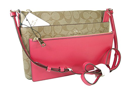 Product Description 2 Piece Set = 1 Purse 1 Pouch Description: Khaki and pink exterior with the C signature logo print. Genuine leather accents and trim. Brass (gold) hardware. Exterior front pocket. ? Fully lined interior with a slip pocket. Back exterior ID pocket. It measures approximately 7 tall x 10 1/2 inches wide. Adjustable shoulder strap. Other Features: Genuine Leather Coach hangtag Coach genuine leather tag sewn into the interior of the bag. The matching pouch that fits into the front pocket measures approximately 9 1/2 x 4 1/4 inches. Tag Information: Style No: F58316 IM Khaki Bright Pink Style Name:? Signature East/West Pop Crossbody MSRP:? $225.00 0