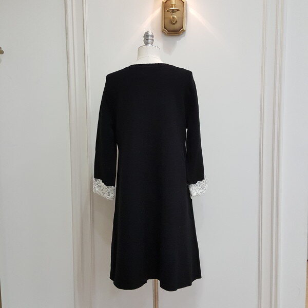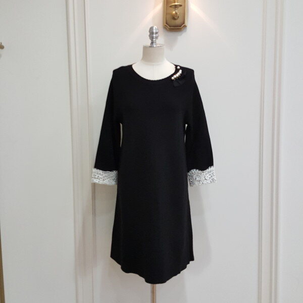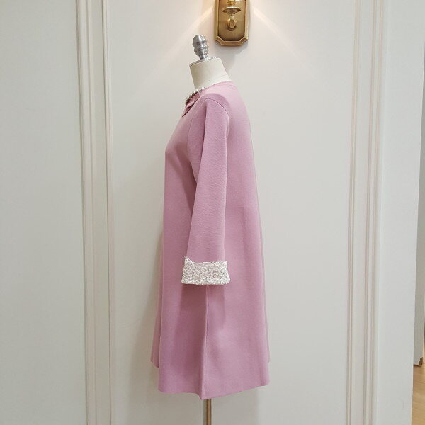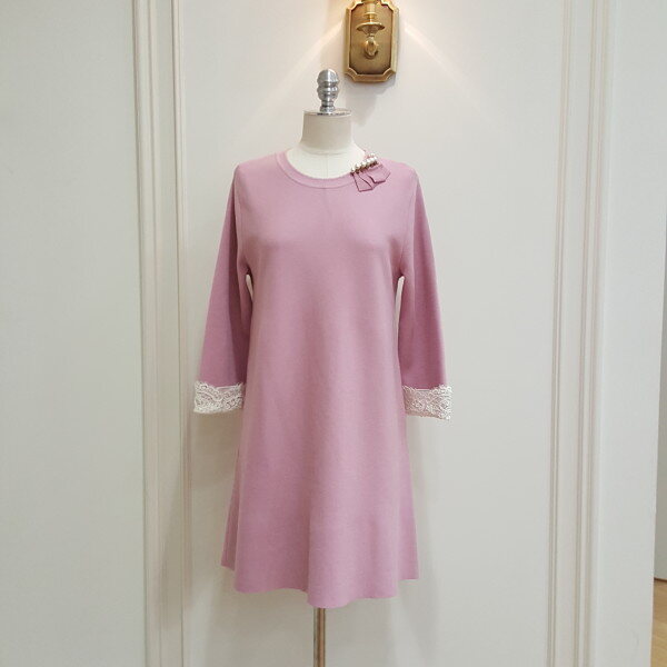 슬림한 A라인의 원피스로 소매의 레이스가 고급스러우며 단정한 느낌을 줌. 탈부착 브로치 진행.