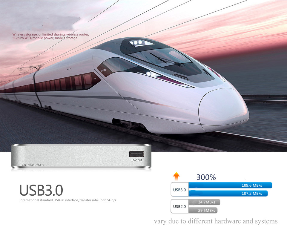 Directly connect with computer with usb3.0 as a high speed storage device. Read speed up to 109.6MB/s, write speed up to 107 MB/s. ( vary due to different hardware and systems ).